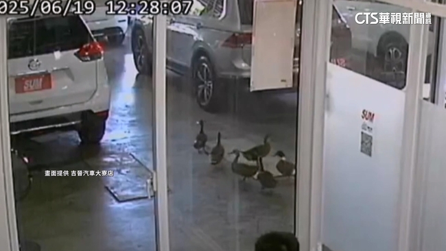 七隻鴨子一隻接一隻,列隊走在車行裡,不斷搖頭晃腦四處張望,就像在賞車,車商忙著和顧客洽談,視線穿過玻璃門,突然發現有七隻鴨成群結隊,悠閒晃過,客人也立刻回頭探看,鴨逃,其他員工也發現鴨子蹤影,鴨子發現自己行蹤暴露,立刻轉身落跑,逗趣模樣讓人看了直呼可愛。