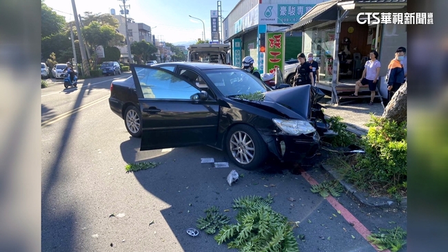 黑色轎車行經道路直行,但開著開著車輛往左偏移,逆向進入對向車道,接著撞上路樹,這麼一撞,轎車引擎蓋整個掀起來,車頭嚴重凹陷變形,劇烈撞擊,樹幹葉子掉落一地,女駕駛受困車內,附近居民趕緊出來協助,先把車門打開通風,就怕女駕駛在車內太悶熱。