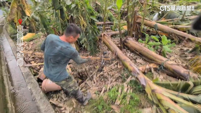 嘉義中埔鄉蕉農陳先生說:「這邊都要割掉砍掉。」拿著鐮刀,砍下斷裂倒伏的香蕉樹,看著整片果園,香蕉樹幾乎都倒了,陳先生真的好心痛,嘉義中埔鄉蕉農陳先生說:「這個全部都是啊。」