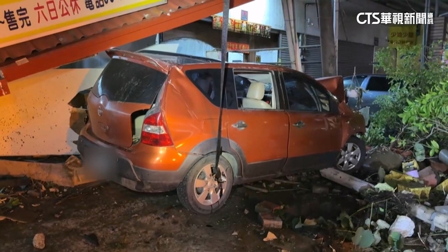 汽車疾駛而過失控偏移,把電桿撞斷,噴出大量火花,路牌遭波及整支被撞飛,車輛還沒停下,又繼續往前,撞進對街的早餐店,鐵皮棚架和招牌瞬間傾倒,汽車零件和被撞飛的物品直接噴飛到大馬路。