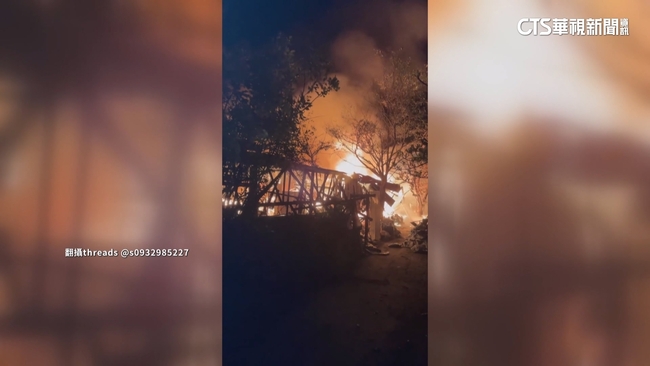 烈火熊熊燃燒劈啪作響,橘紅色火舌將房屋吞沒,房子燒得只剩骨架,消防人員趕到現場,用強力水柱澆灌火源,房屋樑柱被大火燒得有如黑炭,現場看起來怵目驚心簡直成了廢墟,起火時一名婦人受困在屋子裡,兒子想救卻無能為力。