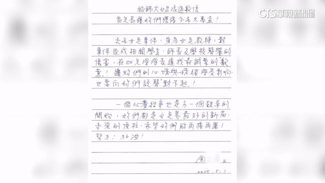 而這封手寫道歉信中寫到,I事件造成學生師長,及學校聲譽的傷害表達誠摯歉意,讓你們的心情與情緒受影響,也要向你們說聲對不起。這樣的說法讓選手好難接受,直言看不懂要表達什麼,道歉有用要警察法律做什麼,更透露教練打給媽媽,希望她下架社群上的文章。