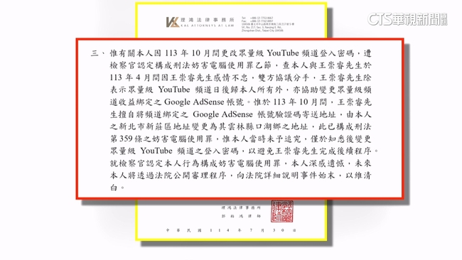 而家寧爸爸及妹妹兩人,則涉嫌蒐集13人的身份證虛報薪資,作假帳列人頭員工,虛列空白款項等共計1,609萬餘元,涉嫌幫助逃漏稅,至於家寧則在2024年間,沒有經過Andy老師同意下,變更頻道密碼,涉嫌妨害電腦使用罪,四人都被起訴。