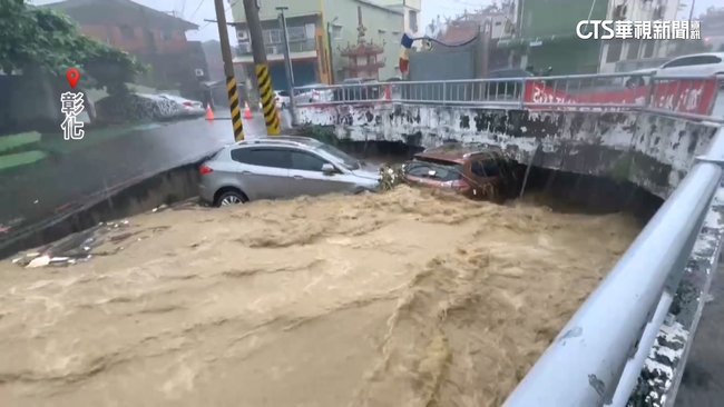 大雨下不停,多地道路變成小型瀑布,彰化地區從30日深夜,到31日清晨狂下豪雨,其中香山里災情相當慘重,在進入鳳山宮的牌樓前方,可以看見兩輛原本停放在路旁的汽車,被衝進水勢暴漲的排水溝,卡在涵洞內動彈不得。