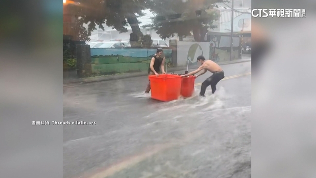 民眾說:「什麼桶子,天啊隔壁。」2大箱橘色塑膠桶,差點跟著水流被沖走,2名男子緊急抓住拖進室內,陽明山區降下大雨,台北市士林區格致路上,水流又大又急,馬路簡直變成滑水道,黃澄澄泥水從管道中傾洩而出,前方的機車不斷被沖刷,今(5)日下午午後對流雲系發展旺盛,強降雨襲擊雙北,山區也傳出災情。