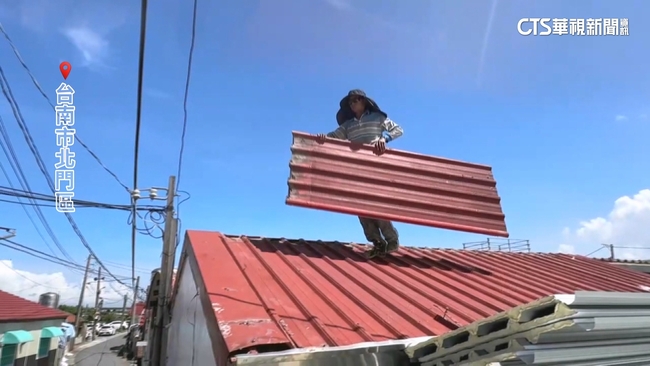 民眾說:「(會煩惱嗎),會,我昨晚都沒睡,擔心又下雨。」的太陽曬不乾煩惱,屋頂的破洞還沒補,新的颱風又來了,台南北門民眾,有人搬著鐵皮趕工蓋住屋頂大洞,有民眾是一早急著爬上屋頂鋪上沙包。