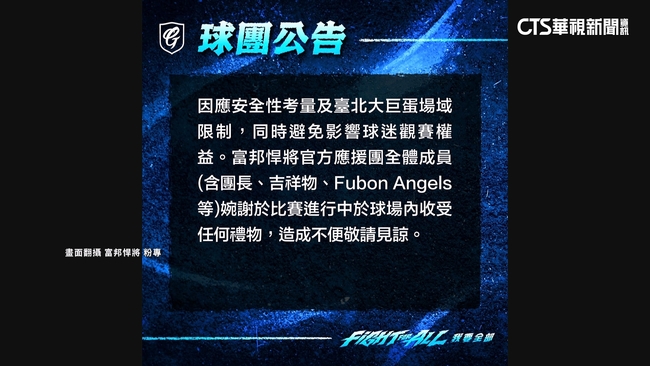由於台北大巨蛋落成後,幾乎每場職棒比賽票房都上看萬人,也因為人數眾多繁雜,出現場內工作人員無法控管的亂象,球團昨(14)日發出聲明「因應安全性考量及台北大巨蛋場域限制,同時避免影響球迷觀賽權益。富邦悍將官方應援團全體成員婉謝於比賽進行中於球場內收受任何禮物。」