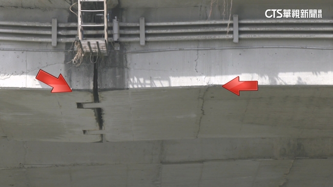 記者許庭綸說:「新生高架橋是台北市南往北,或是北往南的重要幹道之一,同時也是戰時的重要橋樑,但是日前有民眾經過時發現,它的橋底部疑似出現比較大的裂縫。」鏡頭拉近一看,高架橋底接縫處,看起來確實比較開,似乎還有些下沉,而它兩側的橋面,也被網友質疑疑似有裂痕。