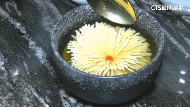 酸甜酸甜,除了可以是初戀的滋味,也是業者的開胃法寶,就算是前菜,也要在顧客心中留下深刻記憶,紀卅梅愛玉干貝,肥美飽滿的干貝,搭配獨門醬汁以愛玉為基底,佐上魚子醬清爽開胃,火鍋業者各顯神通,二本松主打招牌菊花豆腐,還有貳堂鍋物的西瓜汁雪花冰,以及砥鎵鍋物金箔焦糖布丁,在炎熱的夏天,也能抓住顧客的心。
