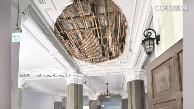 天花板整個下來,這棟建築已有近百年歷史,部分木製梁柱,長期遭白蟻蛀蝕,經地震搖晃後,支撐不住導致坍落,但經專業人員到場評估,建築整體結構仍屬安全,可以正常通行。