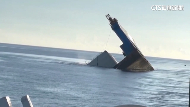 海面上一艘浮台船,被海水吞沒,只剩下不到3分之1的船身,還露在外頭,海水不斷灌入船隻,濺起陣陣水花,船身持續傾斜。目擊者說:「不要擋,不要擋,不用擋啦,它沉下去就過不去了。」