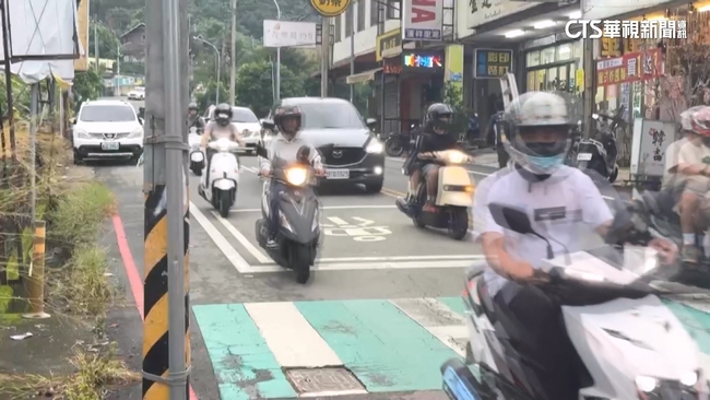 機車一輛接著一輛,沒有斷過,從山坡過彎直直往下衝,車輛來來往往,車速相當快,和走在路邊的學生擦身而過,險象環生。朝陽科大一到下課時間,車潮不斷呼嘯而過,附近的居民說,下午5點後只敢待在家,因為光是過馬路不到5公尺的距離,就得等上至少5分鐘,連站在斑馬線,都擔心學生沒注意,騎太快發生意外。