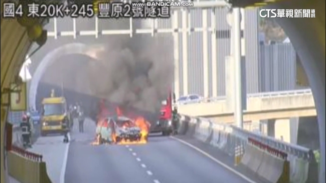 國道4號豐原往潭子20.1K路段,稍早發生火燒車,一輛轎車在隧道口,疑似自撞起火,沒有人員受傷。