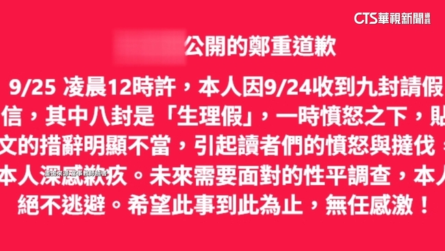 不過這兩篇文章引起許多爭議,目前都已經看不到了,朱姓講師今天凌晨也發出道歉文,稱自己貼文的措辭明顯不當,深感歉疚,未來需要面對的性平調查,絕不逃避。