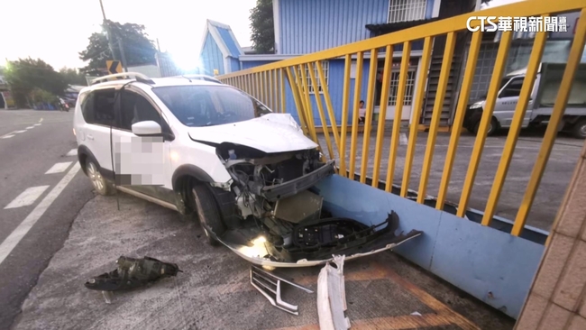 白色轎車開在路上,準備過彎,卻直接偏離車道,完全沒減速直直衝撞對向女騎士,碰的一聲女騎士連人帶車甩飛出去,轎車車頭保險桿嚴重毀損,卡在路旁工廠大門旁邊,員警到場時肇事的蔣姓駕駛,眼神迷茫一臉醉醺醺。