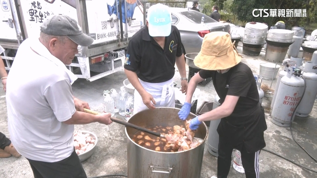 記者蔡銍湣說:「記者旁邊這邊搭起的棚子,就是來到馬太鞍教會這邊幫忙的「義煮團」。」教會外的棚子下義煮團義工一刻都不停歇,堰塞湖溢流花蓮光復,不只需要人力協助救援,大家也得填飽肚子才有力氣做事,看看這深湯鍋燉煮滿鍋的雞腿,那邊的大炒鍋裡也在燉煮食物,要盡可能要在最短時間產出大量餐食,但這關鍵一味卻在路上遇到難關。