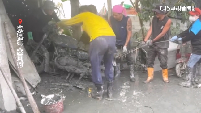 爬上比人還高的土堆,阿嬤彎下了腰清理椅子上的泥,也在這淤泥山中尋找自己的證件及物品,移動時小心翼翼試探,腳下踩的地方是否穩固,讓人看得膽戰心驚,救災民眾說:「一二三,有喔,有了,一二三,有在動。」有志工團到了大同村和泥堆拔河,奮力將卡在屋內的機車給拉出來,而他們腳下踩的地仍然滿是泥濘,屋內也還有的淤泥等著處理。