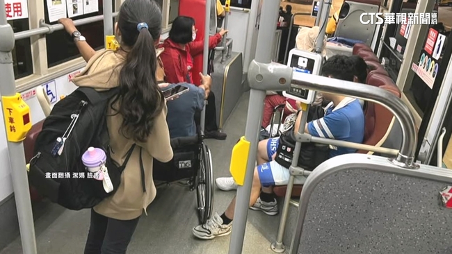 公車上的乘客,有人站著,有人坐著,還有一名坐著輪椅的老先生,但您注意到了嗎?輪椅的車輪下,一名高中生默默伸出一隻腳,幫老先生穩住車子,充當人體車輪擋,高中生說:「司機很容易剎車,急剎之類的,就是他不讓他的輪椅滑動。」民眾說:「很有善心,替不方便的人著想。」