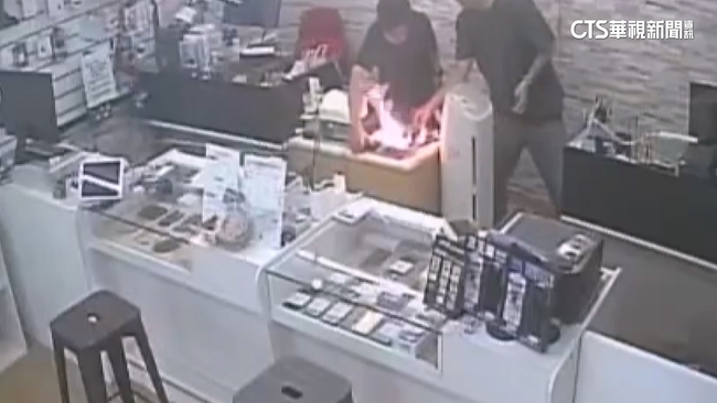 店家監視器拍下,正當工作人員,站在櫃台前,沒想到,放在桌上的平板電腦,突然發出一聲,爆炸聲響,隨後竄出火苗,員工見狀,試圖將明火熄滅,千鈞一髮,突如其來火勢隨即被控制,只是好端端的平板電腦,怎麼會突然起火燃燒,原來上個月22日,鳳山這家通訊行業者,收到這台,顧客使用9年的平板電腦,但疑似長期使用,電池膨脹,才會炸裂起火燃燒。
