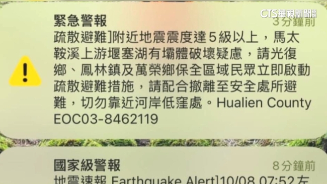 同一時間光復災區一站式服務平台警報大響,民眾的手機也跳出地震警報,人們不約而同查看手機資訊,更掛念山上堰塞湖就怕再有惡水侵襲,沒想到就收到花蓮縣政府發布的警報,要居民立即撤離一度引起恐慌。
