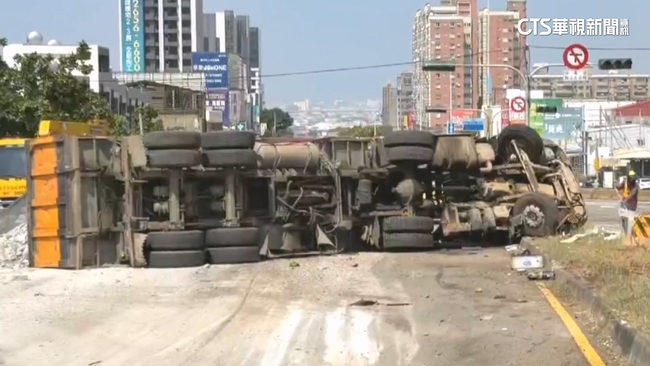 砂石車衝到對向車道,整輛車側翻,大量的建材廢棄物散落在馬路上,後方開車的民眾趕快減速閃避,從外側車道繞過去,因為車子被波及,她趕快停靠路邊打電話給家人,被波及轎車駕駛說:「有車禍,很嚴重,我沒怎樣。」驚險的情況讓民眾嚇壞了。
