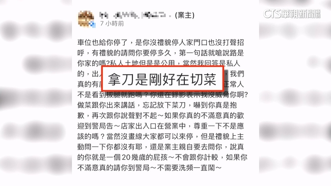 臨停駕駛說:「他(店長)看到我手機一直在錄,說,沒有啊,我不能,我剛剛在做菜不行嗎,我就覺得很瞎啊,就很明顯他在狡辯啊。」為了停車糾紛,竟公然亮刀當事人嚇壞立刻報案,事發就在新北市板橋區這家咖啡店,昨(16)日晚間8點多傳出持利器恐嚇,而遭到指控的是他。