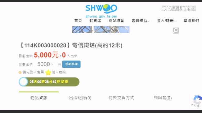 四層樓高的防空警報電信鐵塔佇立在苗栗白沙派出所,鐵塔設置在這裡已經超過18年,如今派出所要進行原址重建,鐵塔功成身退,但苗栗縣警局沒有要直接把它報廢,而是在拍賣網上架,24日開始為期7天公開競標,民眾說:「這個東西不是一般人會要,用得上的人會想要,用不上的,是我也不要,一般百姓絕對不可能會買。」