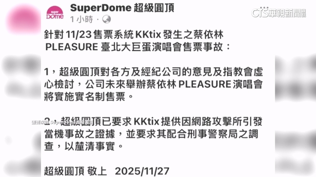 有粉絲表示,雖順利搶到門票,卻在結帳環節卡住,被迫取消訂單。對此,主辦單位發出聲明,表示將虛心檢討,並宣布未來舉辦蔡依林演唱會,將全面實施實名制售票。另外針對當機事故,也已要求平台提供遭網路攻擊所引發系統異常的相關證據,並要求配合刑事警察局調查,以釐清事實。