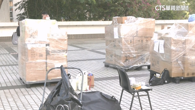 拖板車插入棧板,一箱箱物資早已被膠膜捆好,被志工們拖離廣場,明明是供災民取物品的愛心物資站,卻臨時被要求撤離。記者孫宇莉說:「原本是在商場平台上,一個很大的物資站,但是可以看到現在這邊的物資,昨天都是來開放大家領取,不過今天通通都是打包好,而且是要準備分批,先送到其他地方。」