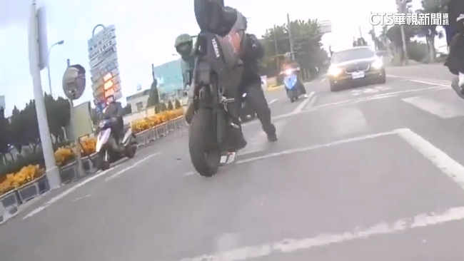 路口剛綠燈,左邊1輛雙載機車急催油門起步,整輛車翹孤輪暴衝出去,後座乘客沒坐穩直接從後座滑了下來嚇到尖叫趕快跳車,前方騎士被機車拖著衝出去,他疑似想控制車頭還是失敗了,最後失去平衡,整輛車倒在道路中間。