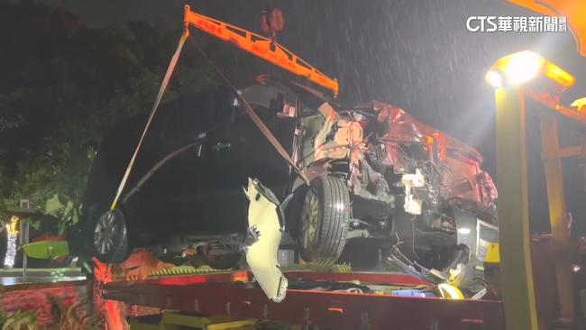 一台黑色廂型車南往北直直開,卻突然向左偏移接著又往右靠,直到整台車撞擊路旁,整台車車頭全毀幾乎成了廢鐵,而號誌桿控制箱整座被撞爛電線外露,現場零件四散,其中還有一頂警帽,目擊民眾VS.記者說:「我們都是聽到砰一聲出來,我們就往後去看,然後就有警察掉到水溝裡面,(警察狀況怎麼樣),很不好。」