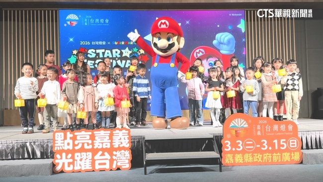 活動主持人說:「台灣燈會在嘉義,比個帥氣的讚。」嘉義縣長翁章,等嘉賓們,站在舞台上比個讚,因為2026台灣燈會將在嘉義盛大登場,神秘嘉賓還有他,日本遊戲主角瑪利歐,在歡呼聲迎接下,緩緩走上舞台。