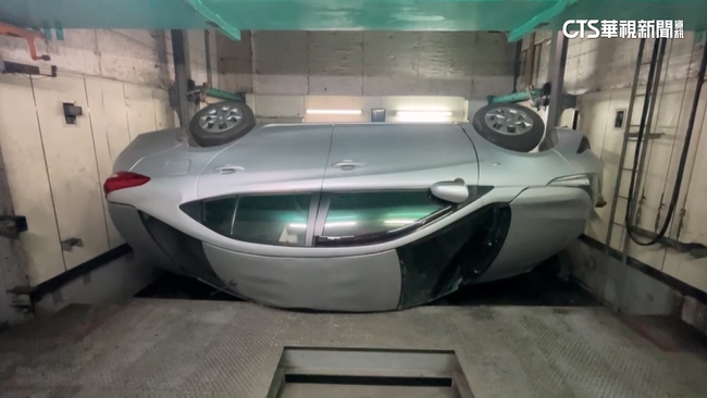 停車塔入口門無法關閉,紅色警示燈持續亮起,因為一台銀色轎車摔落,呈現90度側翻,擋風玻璃碎裂,情況怎麼發生的。記者VS.其他住戶說:「(最低的那一台),它是最低的位置,傾斜這樣掉下來。」、「所以如果從高樓層下來,整個車子就粉碎了(會撞得很慘)。」