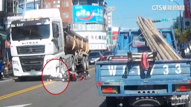 南投縣草屯鎮發生一起驚險車禍,89歲的機車騎士疑似為了左轉,繞到砂石車前方緊貼著車頭行駛,因為砂石車車身比較高,這個位置是視線死角,司機沒看到前方的情況,撞了上去,機車騎士的腳被輪胎輾過骨折。