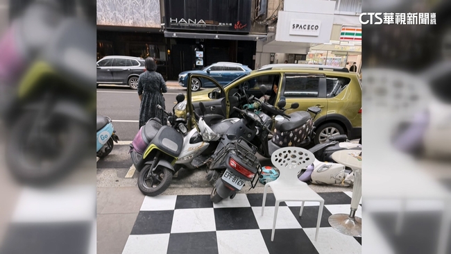 機車東倒西歪車殼損毀,事發在今日上午10點多,台北市中山區農安街,71歲的張姓女駕駛,下車時不慎打成倒車檔,又沒拉手剎車車子不斷後退,女駕駛想追也追不上,車輛一路從對面,跨越雙黃線變逆向,最後撞上停車格內7輛機車。