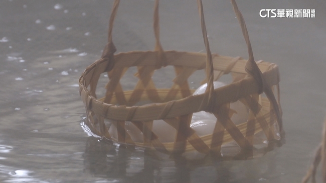 店長表示天氣冷又碰上下雨天,業績通常會掉一半,不過對遊客來說胃暖和了最重要,也能再去煮溫泉蛋暖暖身。記者張小媛說:「現在我拿的這一籃雞蛋是要做什麼呢,我就是要來用溫泉煮溫泉蛋,那在煮之前記得是要先用清水來洗乾淨,大概煮個20分鐘就可以來享用。」