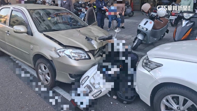 驚險閃過的男騎士,回想事發當下還餘悸猶存,但他後面的車輛就沒那麼幸運,停放現場香檳色的轎車保險桿凹陷引擎蓋掀了起來,就連後照鏡也搖搖欲墜,除了前方受損外,車尾也有擦撞痕跡,因為肇事車輛疑似先碰撞後方貨車,接著誤把油門當剎車踩才會釀成更嚴重事故。