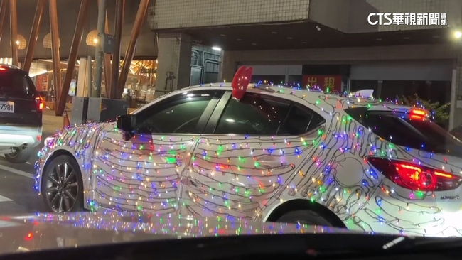 離譜的情況,發生在台中市北屯區崇德路上,畫面上可以看到,轎車的車身,滿滿都是五顏六色的小燈泡,後車窗還有麋鹿造型的紅色耳朵,這輛轎車,並不是停在路邊展示,而是開在路上,吸引不少目光,不過燈泡炫麗的顏色,很容易讓其他用路人分心,警方雖然沒有接獲報案,但如果發生車禍,這些應景的裝飾,恐怕就會成為事故的主因。