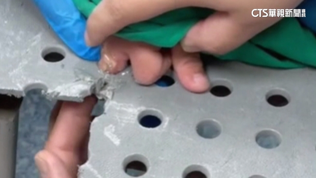 女童坐在椅子上哇哇大哭,消防人員蹲在一旁不斷安撫,仔細一看,原來女童的右手中指,卡進塑膠座椅的圓孔裡,怎麼拔都拔不出來,女童的中指,因為持續拉扯,手指已經變得紅腫,哭聲越來越大,救護人員細心安撫女童,先用綠色衣物包住女童的手保護,接著拿出軍刀鋸,小心鋸開椅面,再換上老虎鉗,一刀一刀剪開塑膠,女童一看到老虎鉗就在手指旁邊,哭得更大聲。