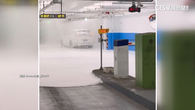 停車場車道入口,天花板滅火系統噴出大量泡沫,一輛白色轎車停在下方,整輛車被淋到都是泡泡,另外一輛車停在入口,不敢往前開,停車場滿是泡泡,民眾看過去,一片白茫茫,地面也積滿泡沫,乍看之下就像下起了雪,來到一片雪白世界。