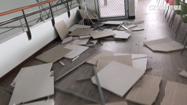 天花板震落砸在地面上,掉落的殘骸碎的碎裂的裂,往上一看輕鋼架懸掛在半空中已經凹陷變形,餐廳內的桌椅東倒西歪,記者說:「比手指頭還寬。」牆壁出現長長一條裂痕,從地面延伸到天花板,比一比裂縫寬度甚至比成年人的拇指還要寬,學生VS.記者說:「(睡覺的時候會不會很擔心餘震),有啊,三點多的時候,就有又震,然後我們就全部跑到外面去。」