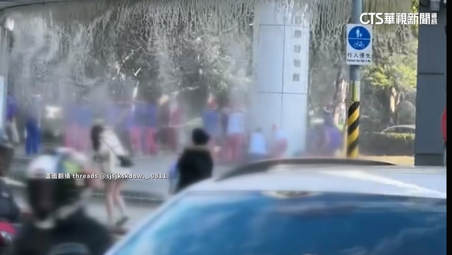水幕隨著強風吹拂,不斷往外灑,一旁經過的民眾,除了頭髮被吹亂了,身上的衣服也差點被失控的水幕噴到,另一段畫面清楚拍下,人行道已經濕了一大片,旁邊正好就有一群戴著耶誕帽辦活動的民眾,但水隨著風朝四處噴灑,民眾記錄下整段畫面,懷疑這真的有辦法從旁邊安全經過嗎。