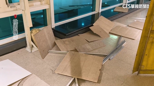 桃園機場二航廈傳出災情,輕鋼架天花板有大片崩落,候機室內也一片狼藉,讓當時在站內的旅客嚇得不輕。