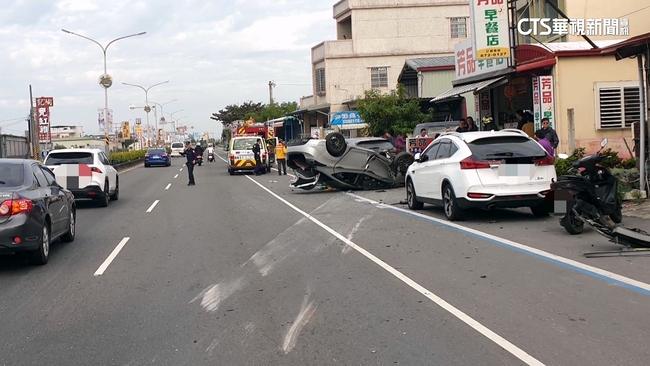 事發就在1日早上八點多,87年次張姓男駕駛,開著小客車,行經台一線,北上443.4公里處時,疑似疲勞駕駛,先是擦撞中央隔島,而車輛隨即失控翻覆,波及,停放路旁的1部機車及2部自小客車,駕駛及乘客共4人,這巨大撞擊聲響,也讓一旁不到50公尺的派出所員警,立即前往處理,並通報救護人員,將傷患陸續送醫治療。