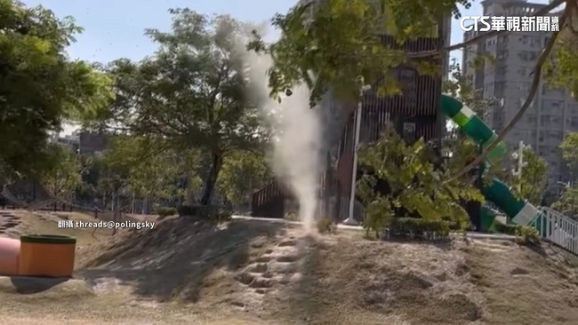公園草皮地面,突然間,大量塵土往天空中飛散,但這不是灑水器沒關好,塵土就像是小龍捲風一樣,從地面上冒出,當時一旁還有小朋友在玩耍,一看到這特殊景象就怕遭波及,驚聲尖叫隨後停下原本動作,嚇得趕緊逃離。