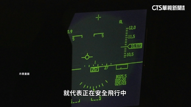 F16儀表板上的抬頭顯示器,跑滿各式各樣的符號,得以辨別天空和地面,再確認小飛機是否和天地線重疊,就代表正在安全飛行中。