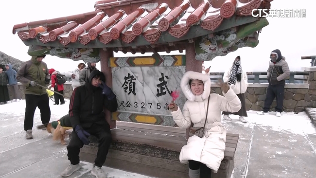 記者徐孟蘭說:「我們可以看到,現在已經有明顯積雪的情況,上武嶺亭的樓梯,都有大片的積雪。」民眾準備好幾套塑膠模具組,做出招財貓、鱷魚和鴨子的造型雪球,還有人帶著家裡的柴犬,一起來追雪,主人不但戴上柴犬造型的帽子,也幫狗狗穿上厚厚的外衣,做好保暖。