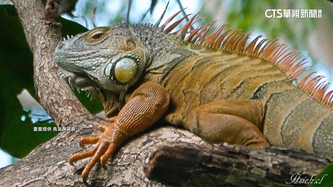 這隻金黃色巨無霸綠鬣蜥,頭尾長超過1公尺,在台南永康祥合公園,去年就被民眾發現,但因為牠常攀爬在樹上,曬日光浴,位置較高很難捕捉,因此成功躲過多次獵捕,就在公園裡長達一年多,直到最近,農業局出動,有神射手之稱的,綠鬣蜥承辦人持獵槍出動,才成功將牠捕捉歸案。