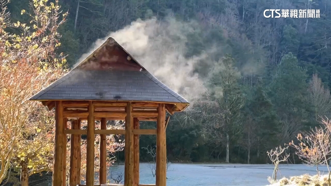 台中武陵農場清晨受到輻射冷卻影響,早上7點多氣溫只有零下1.2度,草地還有屋頂都結了厚厚冰霜,8點多太陽出來,陽光照射下,結霜的草地和涼亭屋頂開始冒白煙,搭配周圍大樹環繞,宛如仙境。