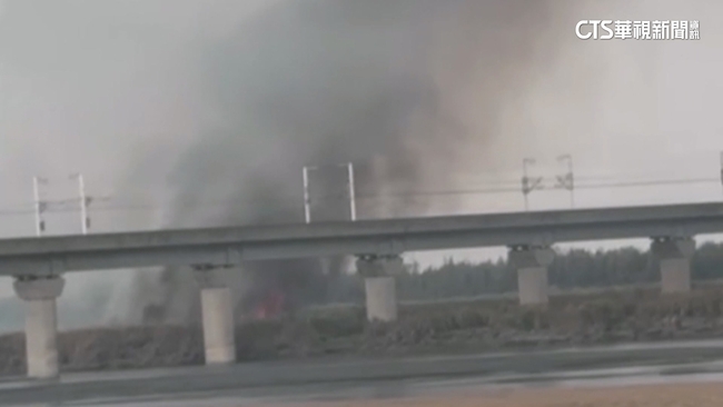 雲林高鐵橋旁發生火災,濃濃黑煙直衝天際,下方草叢冒出熊熊火光,火勢延燒1公頃,濃煙中還夾帶黑色條狀的灰燼,黑色灰燼飄得相當遠。